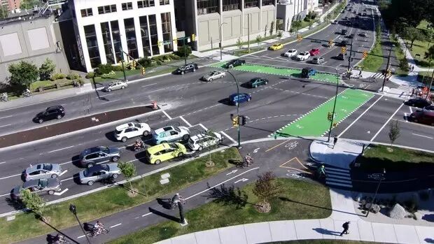 一些北美城市設置了所謂“受保護交叉口”(又名“荷蘭做法”—如題圖溫哥華照片所示) ,亦即通過混凝土交通島的方式確保道路交叉口車道之間的隔離。更為常見的做法是“混合區”,在這一區域之中,騎行者必須與小汽車共用空間。另外還有一些路口使用專門的 信號定時方式,從而幫助自行車騎行者能夠與機動車交通適當分開。