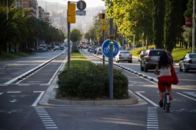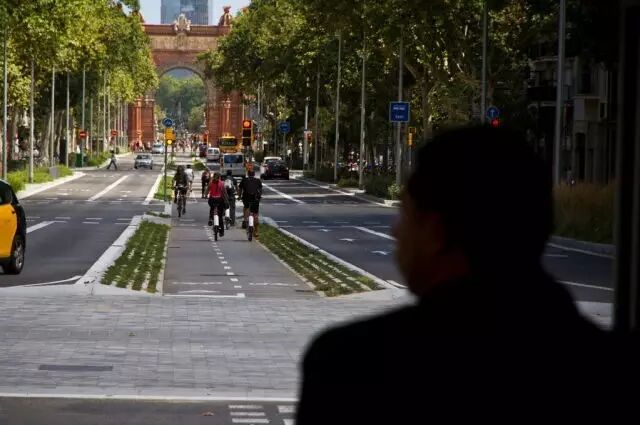 巴塞羅那市的一處不同在于,這個城市大部分區域都是30 km/h (20 mph)限速區。該市致力于讓所有交通慢下來,從而挽救生命、減少傷害,并創建一個更為人性化尺度的城市。位于道路中間的自行車道引向環狀交叉路,這可比把你丟到以汽車為中心的道路交叉口可人性化多了。華盛頓特區的自行車基礎設施則是為那些健身者和勇敢者而設計,并非為絕大多數人提供。這絕對不是一項能夠鼓勵自行車出行成為重要交通方式的明智之舉。
