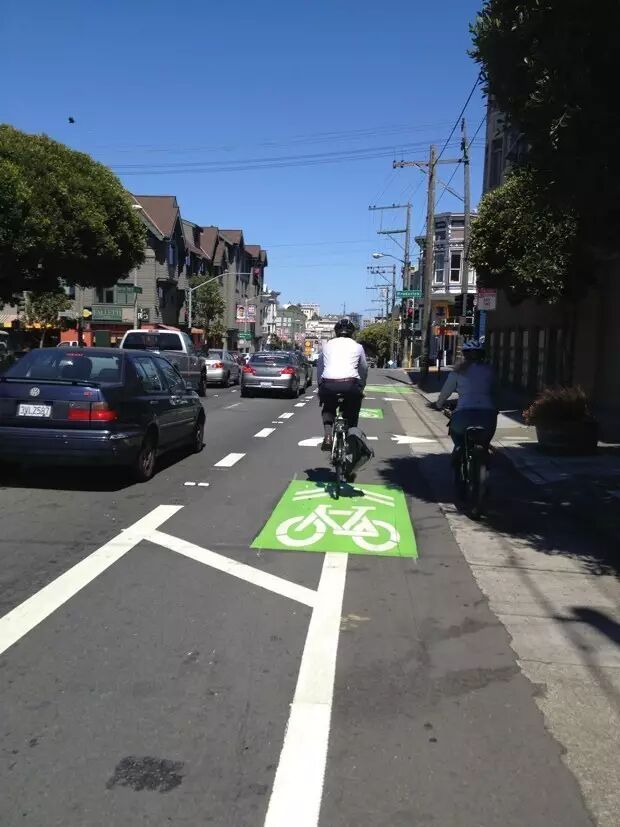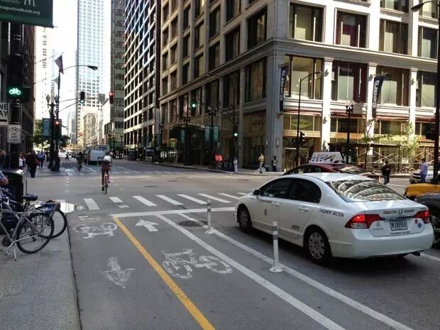 看著來自于華盛頓特區的照片,我立即冒出來的想法就是:"我如何才能夠到達位于道路中央的自行車道?”難道我應該在下一個交叉口推著自行車進入嗎? 我怎么可能愿意帶著我的孩子或者祖父母在汽車飛馳而過的貧瘠的荒地上騎自行車呢?